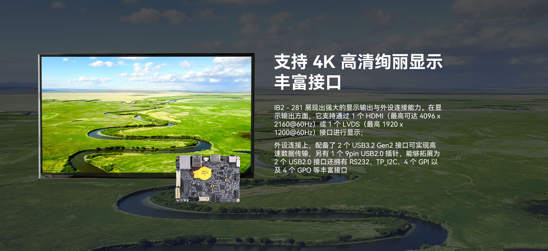 IB2-281支持4K超高清输出,配备1个HDMI(最高可达 4096 x 2160@60Hz)及1个LVDS接口进行显示,为信息显示等场景提供清晰画质;配备2个USB3.2 Gen2 接口,适配多种IoT设备连接需求。还有1个2.5GbE网口,即使在高峰时段也能无延迟地处理众多客户的购买需求,保证了自助服务的连续性和稳定性。